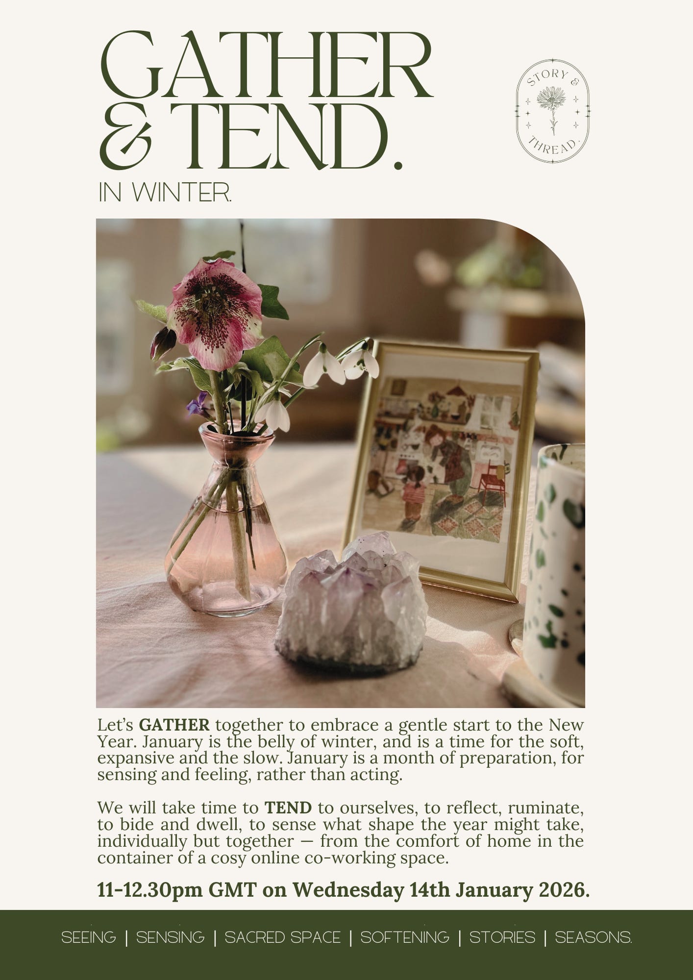 We will gather from 11-12.30pm GMT on Wednesday 14th January to embrace a soft, expansive and slow start to the year, in the Gather & Tend. winter co-working space.