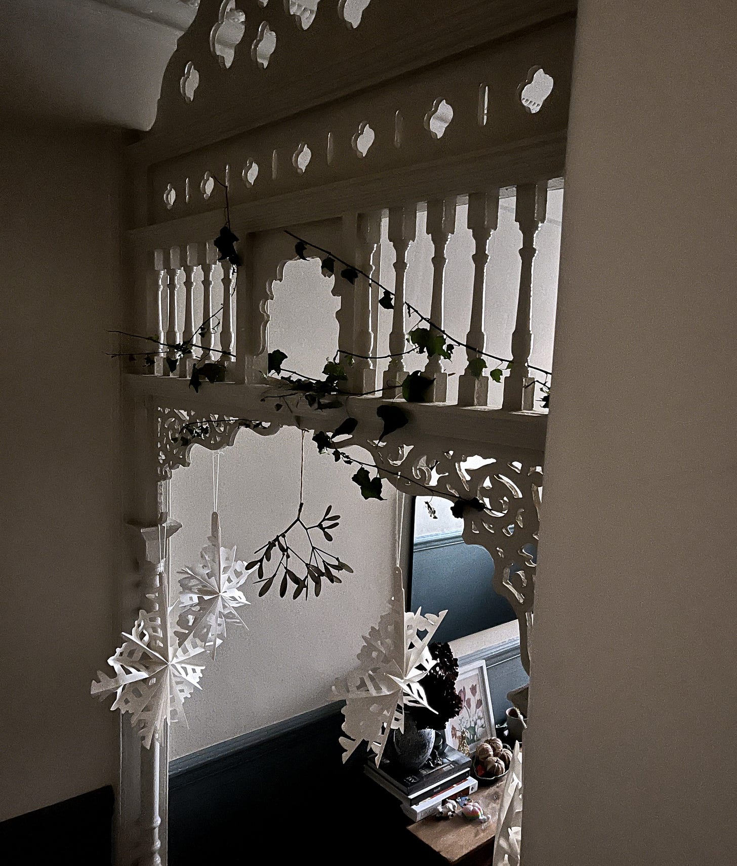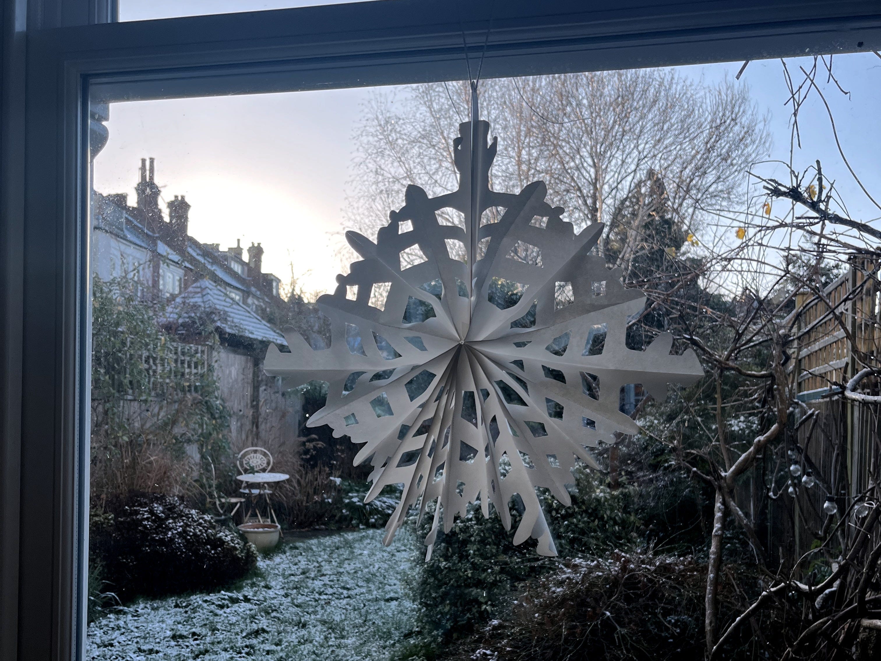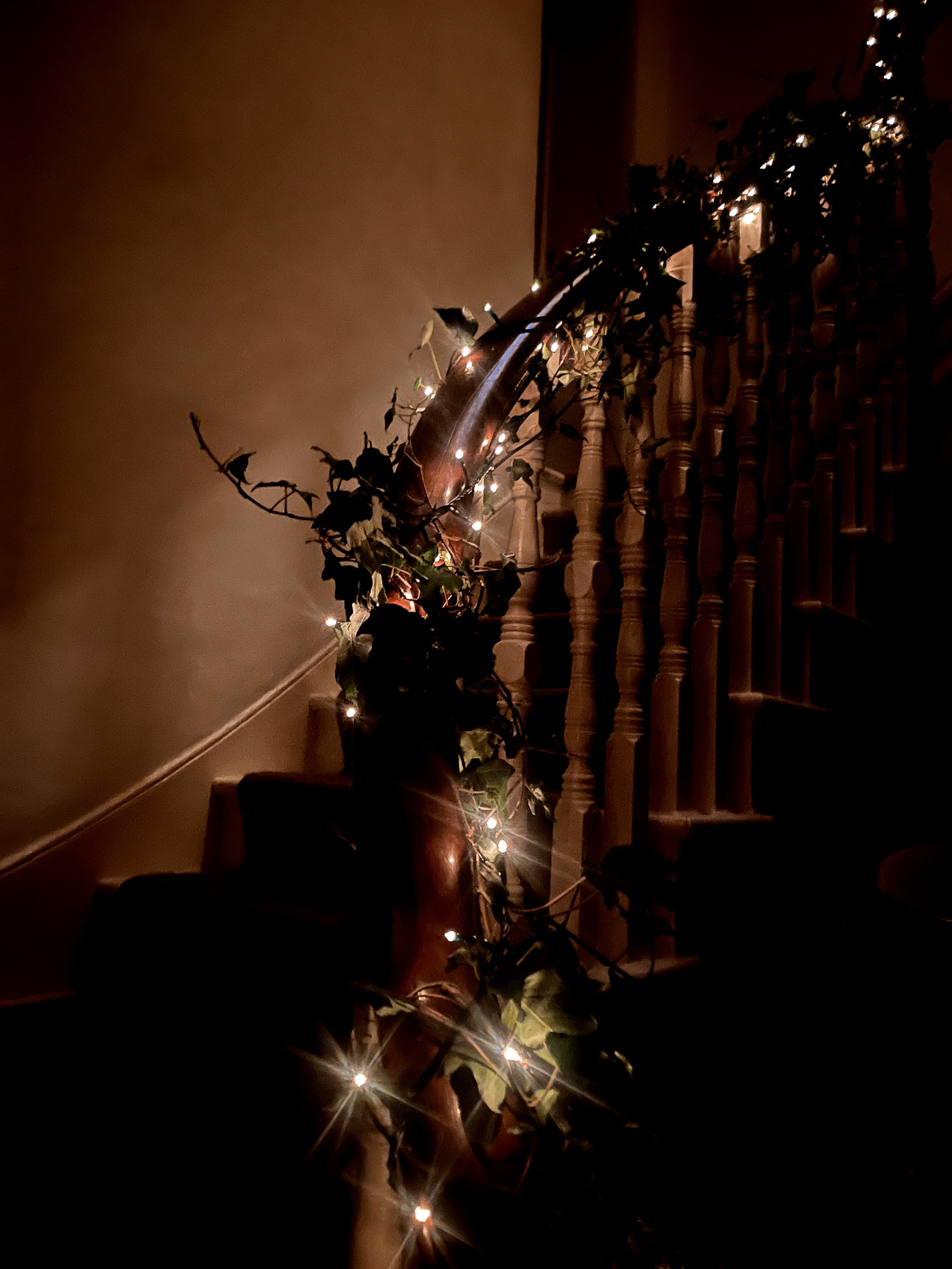 Next, I turn on the fairy lights that are entwined with ivy wrapped around the banister; and switch on the twinkly lights on the Christmas tree (though I realise these days are numbered!), and light candles that glow and diffuse a familiar Christmassy scent. I bathe in the cool luminescence of the pale sunshine that floods our living room at the back of the house on a clear day, I marvel at the piercing clarity of the winter moons (hello Full Wolf Moon!), and I have been spotting glittery stars everywhere, both in the sky and in the faded finery of Christmas.